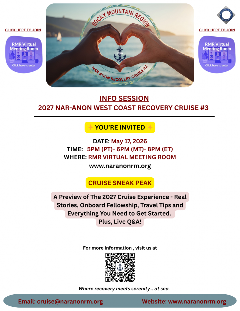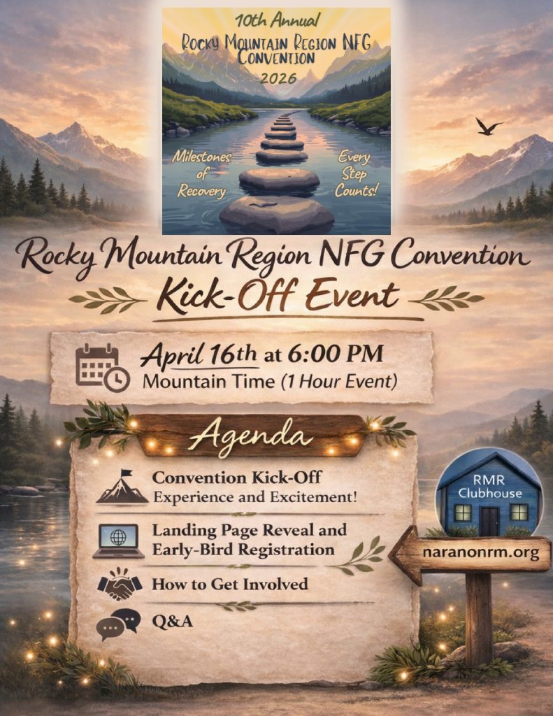 The Lifeblood of the Nar-Anon Fellowship One hour every Tuesday, 02/03/2026 – 04/21/2026, in the RMR Clubhouse. 3pm PST | 4pm MST …