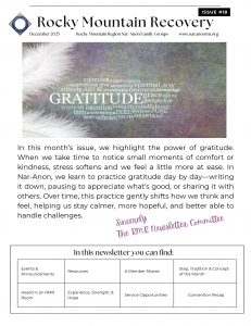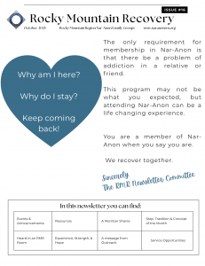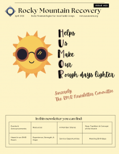 The Rocky Mountain Recovery newsletter is an electronic publication emailed to subscribers on a regular basis throughout the year. This publication is used to share event info, member stories, resources, region meeting notes, and of course – experience, strength, and hope. We hope you find this newsletter to be informative, entertaining, and another great tool for recovery. – The RMR Newsletter Committee